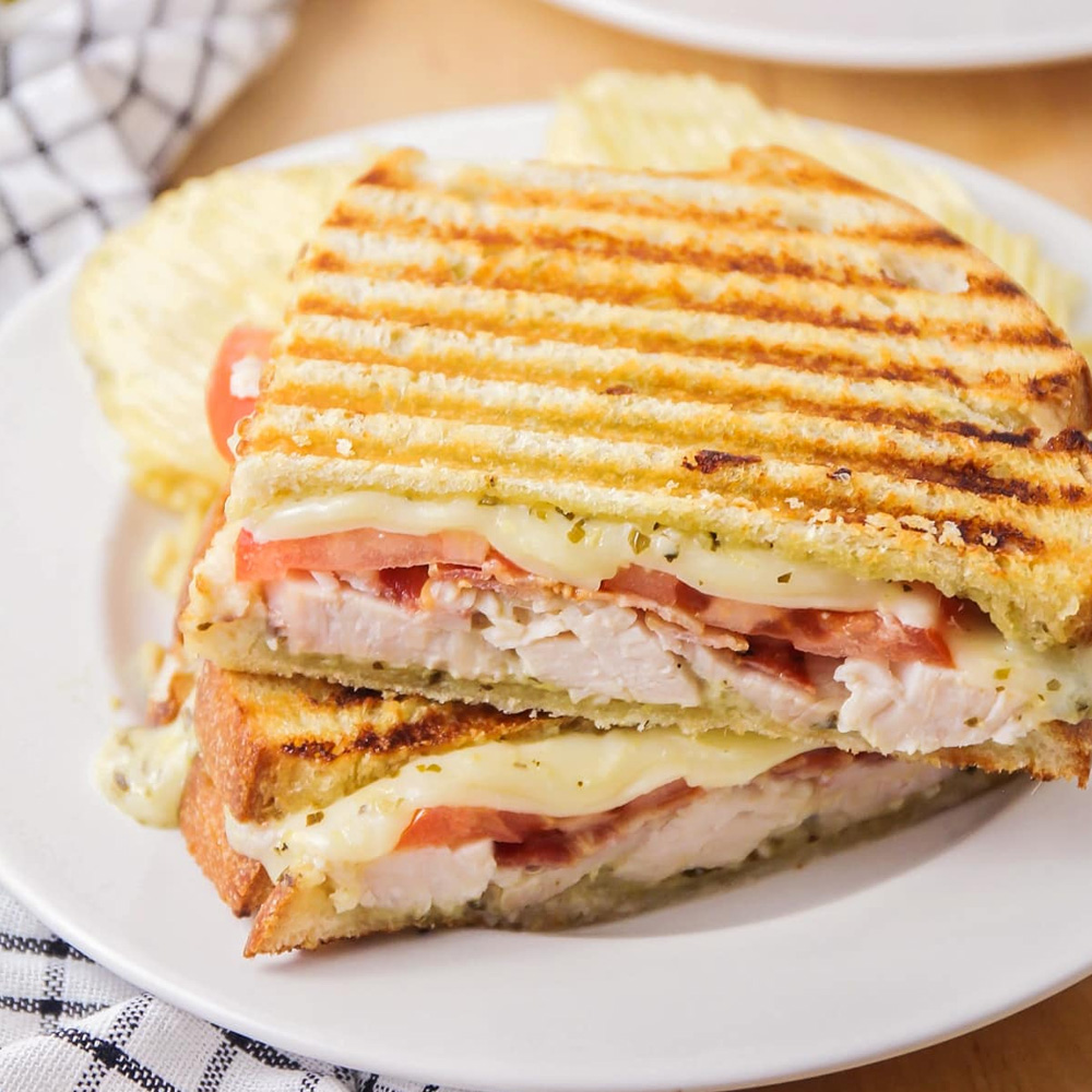 150 گرم شنیسل سینه مرغ گریل شده، پنیر پیتزا، قارچ، نان باگت