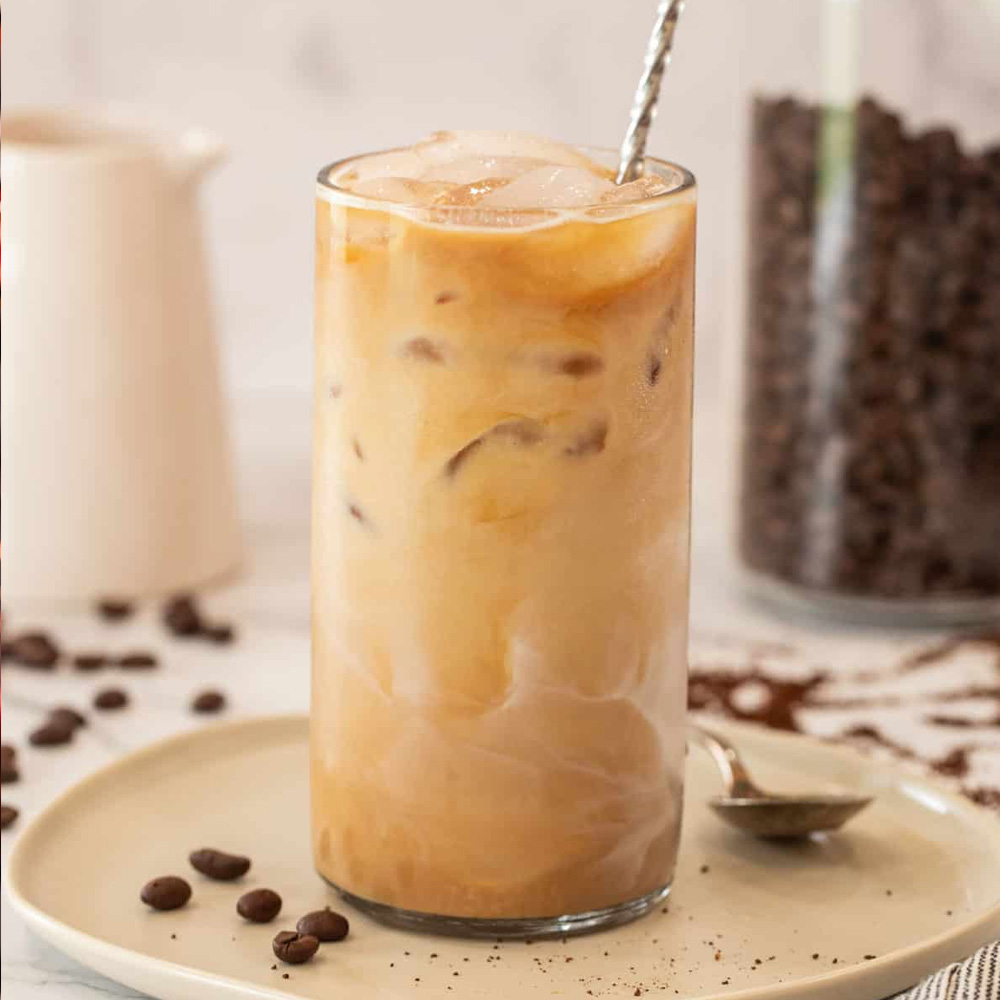 ۳۰۰ میلی لیتر، یک شات اسپرسو ۸۰% عربیکا و ۲۰% روبوستا، شیر، سیروپ کارامل، یخ