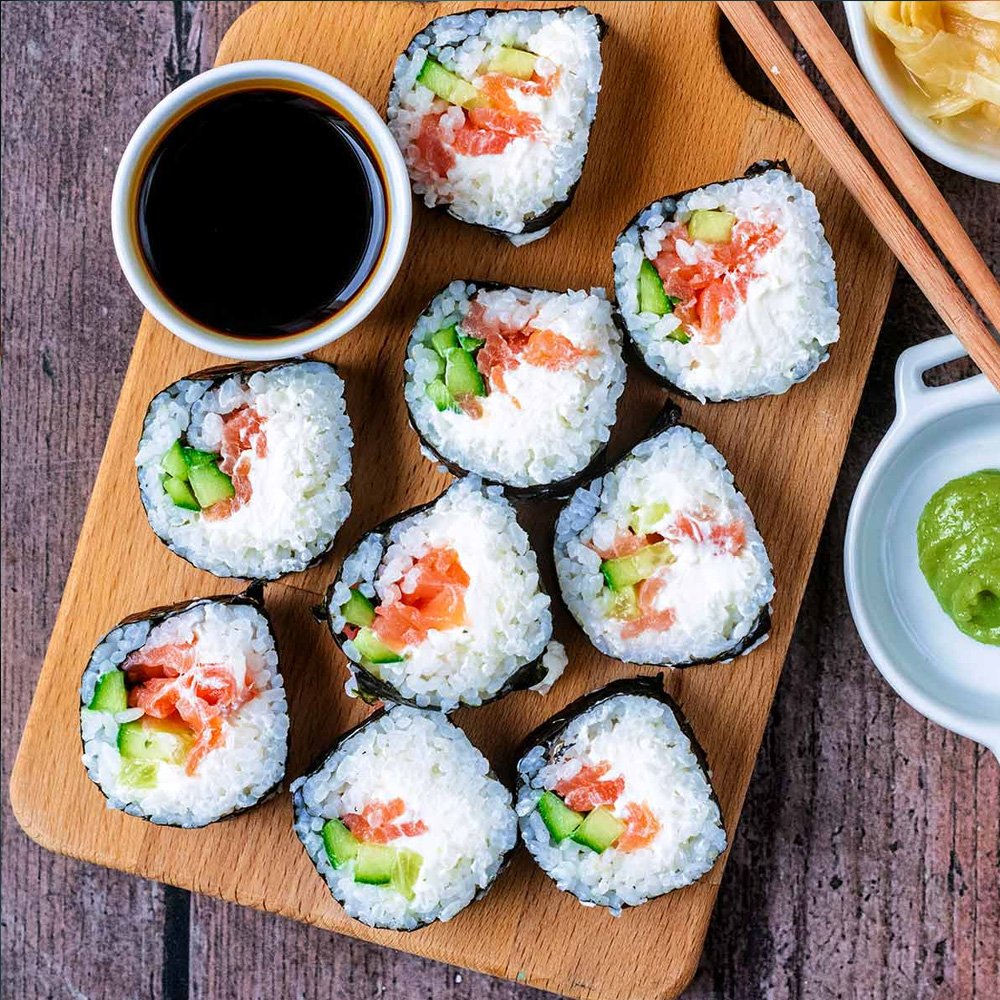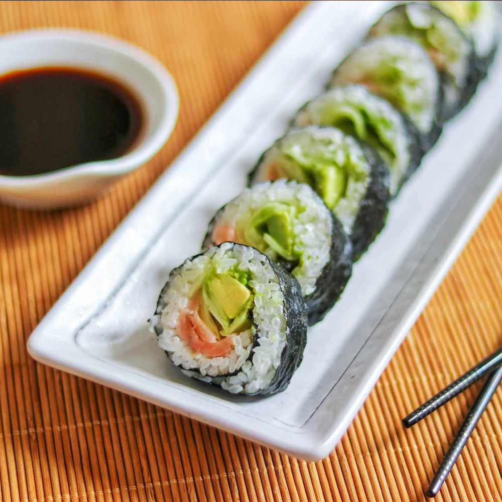یک رول ۸ تکهای، برنج ژاپنی، ماهی سالمون، آووکادو، پنیر فیلادلفیا، کنجد
